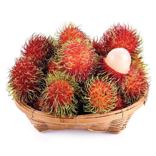 Spiky hairy green stalks and pinkish external skin encases cloudy white refreshing tropical fruit.